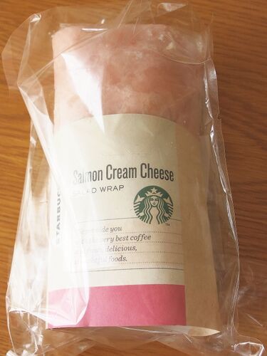 スタバの《サラダラップ サーモンクリームチーズ》。 ピンク色の生地がカワイイ♪ クリームチーズたっぷりで満足(*´Д`)