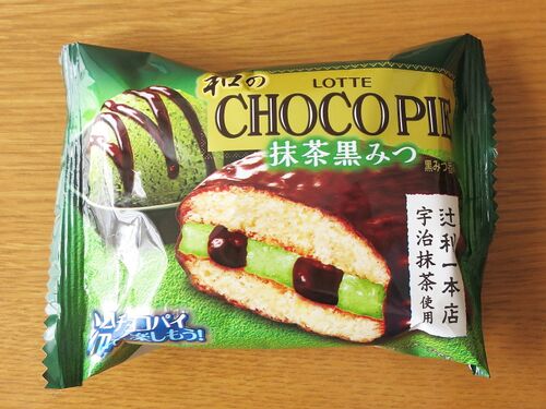 ロッテの《和のチョコパイ 抹茶黒みつ》。 黒みつが一部にしか入っていなかった。 おかげで、全然 黒みつの味しなかったよ。 ただの抹茶風味のチョコパイでした。
