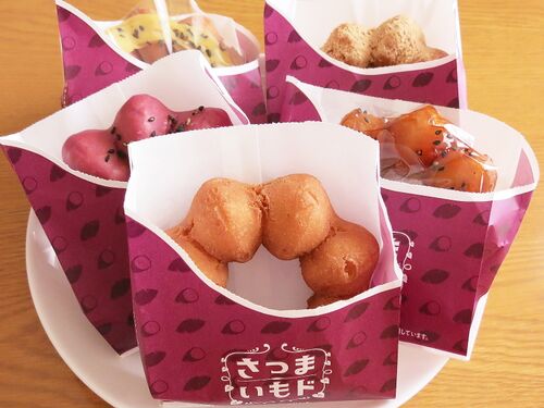 ミスドのイモイモしいドーナツ、さつまいもド。 《さつまいもド プレーン》。 《さつまいもド 紫いも》。 《さつまいもド 大学いも》。 《さつまいもド スイートポテト》。 《さつまいもド 黒みつきなこ》。 一度に5つ全部は食べられないので、半分に切って…