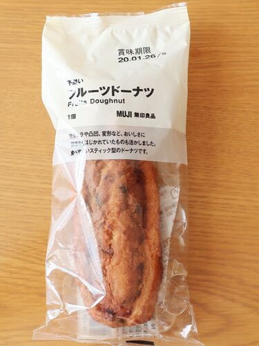 無印良品の《不揃い フルーツドーナツ》。 オーブントースターで温めてから食べました。 甘さ控えめで素朴な味。 ドライフルーツのおかげで飽きずに食べられた。 食感は ちょっと もっさり。 キャラメルドーナツほどじゃなかったけど、やっぱりアルコール製…