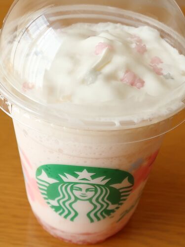 スタバの《さくらさくらんぼフラペチーノ》。 金平糖が かわいい♡ 氷少なめで。 ほんのり甘酸っぱい…てか、甘いw もう少し酸味がある方が いいな。